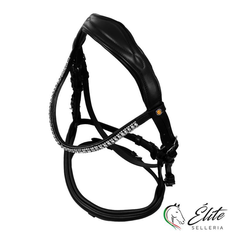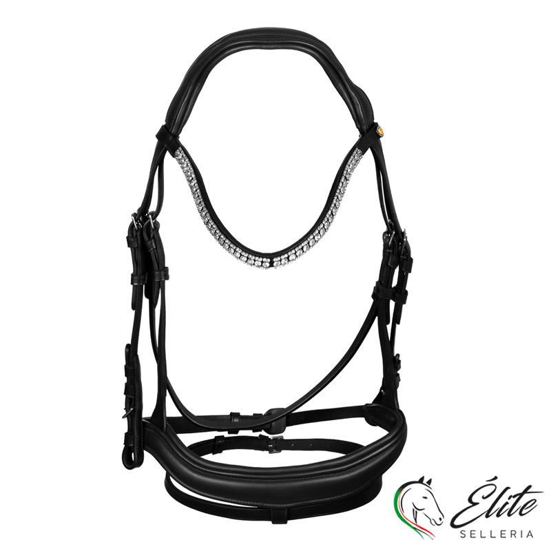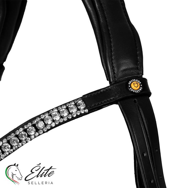 Testiera inglese in morbida pelle italiana di alta qualità. Le fibbie in acciaio inossidabile garantiscono sicurezza, stabilità e durata. Con frontalino in strass.