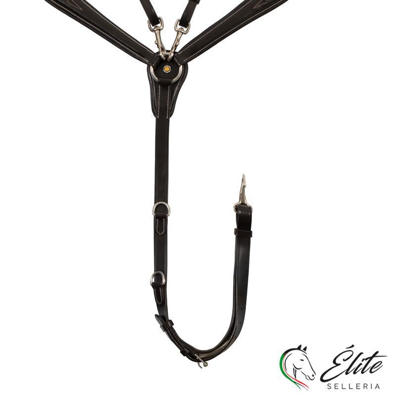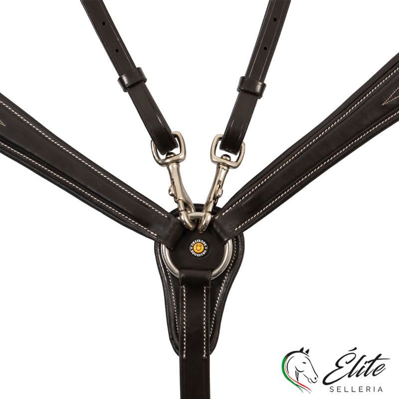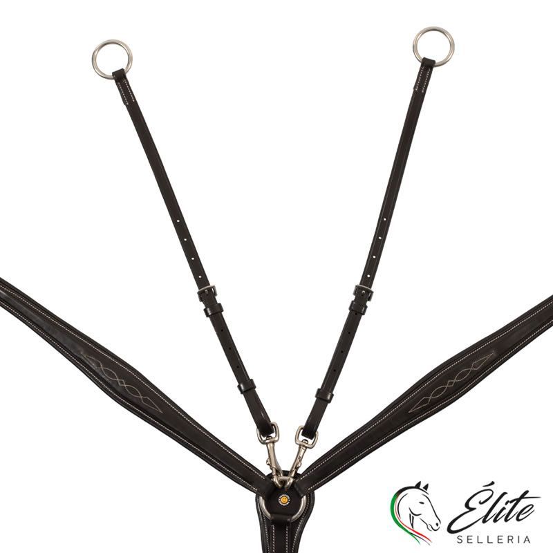 Pettorale con forchetta in pelle conciata con decorazioni ricamate, che limita i movimenti della testa del cavallo verso l'alto e quelli della sella.