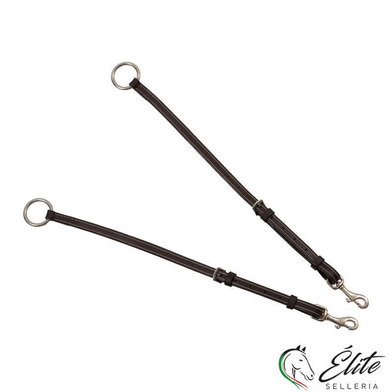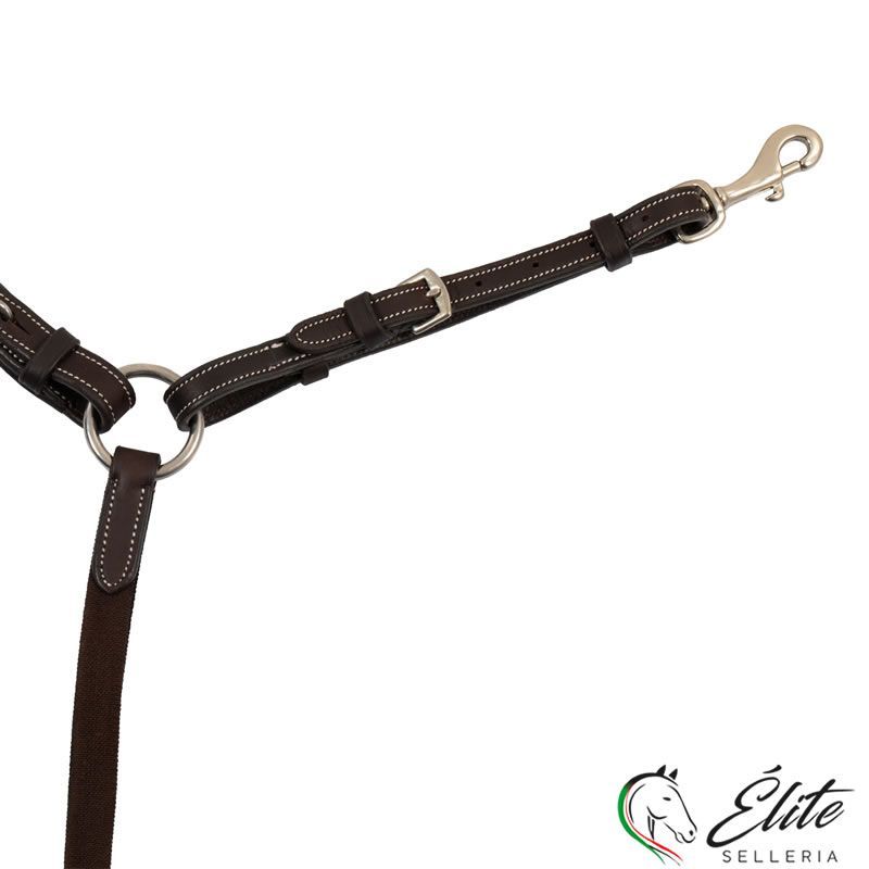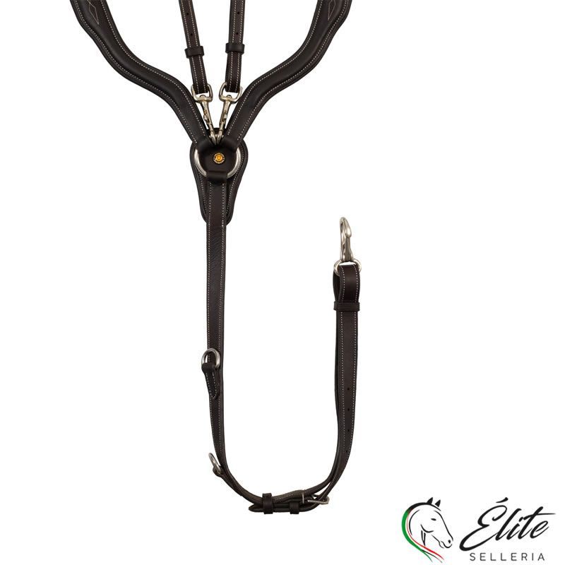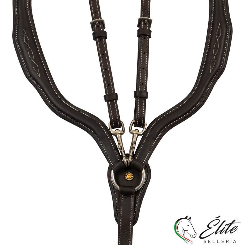 Pettorale con martingala in pelle conciata e doppiata sul petto. Ideato per limitare i movimenti della testa del cavallo verso l'alto e quelli della sella.