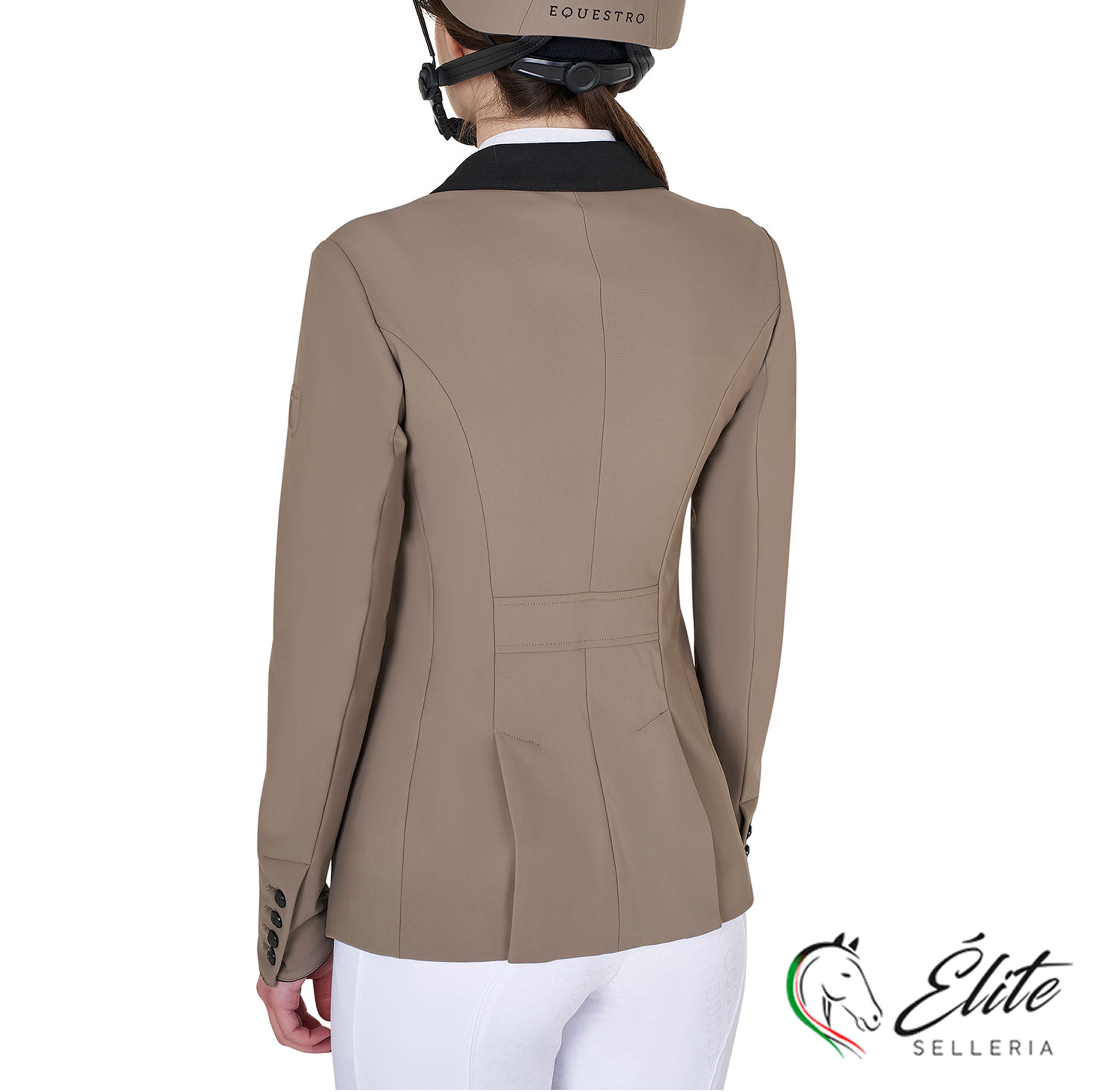 Giacca donna da concorso, modello Elegance, con tre bottoni e patch con logo Equestro sulla spalla. Tessuto tecnico traspirante.